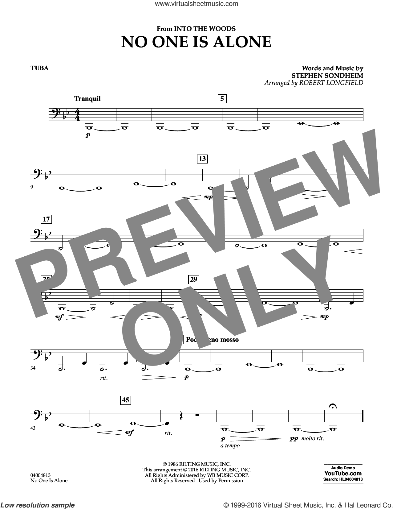 Digital sheet music for concert band (tuba), from No One Is Alone (from Into the Woods)|, version 22.Publisher: Hal LeonardContributors to this music title:Robert Longfield (arranger)This item includes: PDF (digital sheet music to download and print)Instrumentation:concert band (tuba)Skill Level:intermediateGenre:musical/show, broadwayPages:1