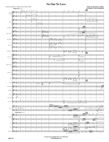 Full Orchestra - Level 4 - Digital Download SKU: A0.806774 Composed by Stephen Foster. Arranged by Glen Poehlmann. Romantic Period. Score and parts. 67 pages. Arrangements by GPoehlmann #5853629. Published by arrangements by GPoehlmann (A0.806774). NO ONE TO LOVE arranged for FULL ORCHESTRA.  A rich and dramatic orchestration of the 1862 song by Stephen Foster.191 measures. Performance Time approx. 6:15.  Key G - A.  Meter: 3/4.  Medium Difficult (Grade 4-)Instrumentation: Piccolo, Flute 1/2, Oboe 1/2, English Horn, Clarinet 1/2, Bass Clarinet, Bassoon 1/2, Contrabassoon, Horn in F 1/2/3/4, Trumpet 1/2/3, Trombone 1/2/3, Tuba, Timpani, Mallet Percussion (Glockenspiel, Xylophone, Chimes), Percussion (Snare Drum, Suspended Cymbal, Bass Drum, Triangle), Harp, Violin 1/2, Viola, Cello, Bass. This product was created by a member of ArrangeMe, Hal Leonard's global self-publishing community of independent composers, arrangers, and songwriters. ArrangeMe allows for the publication of unique arrangements of popular titles and original compositions from a variety of voices and backgrounds. The length, difficulty, and retail pricing are determined solely by the discretion of the person who arranged or composed it. About Digital Downloads Digital Downloads are downloadable sheet music files that can be viewed directly on your computer, tablet or mobile device. Once you download your digital sheet music, you can view and print it at home, school, or anywhere you want to make music, and you don’t have to be connected to the internet. Just purchase, download and play! PLEASE NOTE: Your Digital Download will have a watermark at the bottom of each page that will include your name, purchase date and number of copies purchased. You are only authorized to print the number of copies that you have purchased. You may not digitally distribute or print more copies than purchased for use (i.e., you may not print or digitally distribute individual copies to friends or students).