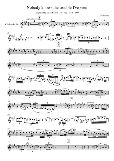 Clarinet Solo - Level 3 - Digital Download SKU: A0.772479 Composed by Traditional. Arranged by David Kocijan. Blues,Christian,Gospel,Sacred,Spiritual. Individual part. 2 pages. David Kocijan #5012735. Published by David Kocijan (A0.772479). Clarinet transcription.Backup music available! facebook.com/davidkocijan This product was created by a member of ArrangeMe, Hal Leonard’s global self-publishing community of independent composers, arrangers, and songwriters. ArrangeMe allows for the publication of unique arrangements of both popular titles and original compositions from a wide variety of voices and backgrounds. About Digital Downloads Digital Downloads are downloadable sheet music files that can be viewed directly on your computer, tablet or mobile device. Once you download your digital sheet music, you can view and print it at home, school, or anywhere you want to make music, and you don’t have to be connected to the internet. Just purchase, download and play! PLEASE NOTE: Your Digital Download will have a watermark at the bottom of each page that will include your name, purchase date and number of copies purchased. You are only authorized to print the number of copies that you have purchased. You may not digitally distribute or print more copies than purchased for use (i.e., you may not print or digitally distribute individual copies to friends or students).