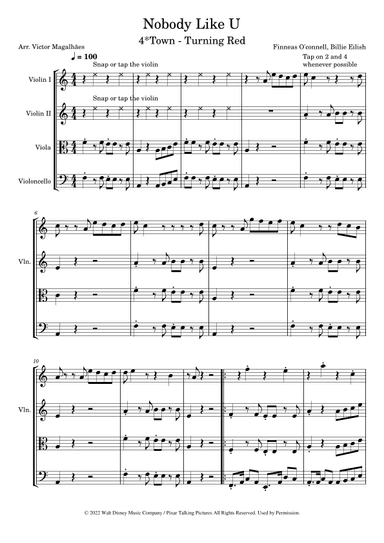 String Ensemble Cello,Double Bass,Piano,Viola,Violin - Level 3 - Digital Download SKU: A0.1189119 By 4 TOWN. By Billie Eilish and Finneas O'Connell. Arranged by Dan Edwards. Broadway,Children,Classical,Film/TV,Musical/Show,Pop. 26 pages. Arr. Dan Edwards #788739. Published by arr. Dan Edwards (A0.1189119). Nobody Like U from Turning Red, written by Billie Eilish & Finneas, arranged for string orchestra & piano by Dan Edwards.Contains a full score (14 pages) and a complete set of parts (Violin 1, Violin 2, Viola, Cello, Bass, & Piano - 2 pages each). Dan is a prize-winning composer, arranger, producer and multi-instrumentalist, and for years was the Staff Arranger for the Countess of Wessex's String Orchestra (part of the British Army) in London. This product was created by a member of ArrangeMe, Hal Leonard's global self-publishing community of independent composers, arrangers, and songwriters. ArrangeMe allows for the publication of unique arrangements of popular titles and original compositions from a variety of voices and backgrounds. The length, difficulty, and retail pricing are determined solely by the discretion of the person who arranged or composed it. About Digital Downloads Digital Downloads are downloadable sheet music files that can be viewed directly on your computer, tablet or mobile device. Once you download your digital sheet music, you can view and print it at home, school, or anywhere you want to make music, and you don’t have to be connected to the internet. Just purchase, download and play! PLEASE NOTE: Your Digital Download will have a watermark at the bottom of each page that will include your name, purchase date and number of copies purchased. You are only authorized to print the number of copies that you have purchased. You may not digitally distribute or print more copies than purchased for use (i.e., you may not print or digitally distribute individual copies to friends or students).