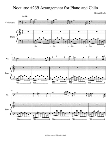 Cello,Piano - Level 2 - Digital Download SKU: A0.907863 Composed by Ronald J. Karle. Concert,Contemporary,Instructional,Sacred,Standards. Score and part. 2 pages. Ronald J Karle #5018971. Published by Ronald J Karle (A0.907863). This product was created by a member of ArrangeMe, Hal Leonard's global self-publishing community of independent composers, arrangers, and songwriters. ArrangeMe allows for the publication of unique arrangements of popular titles and original compositions from a variety of voices and backgrounds. The length, difficulty, and retail pricing are determined solely by the discretion of the person who arranged or composed it. About Digital Downloads Digital Downloads are downloadable sheet music files that can be viewed directly on your computer, tablet or mobile device. Once you download your digital sheet music, you can view and print it at home, school, or anywhere you want to make music, and you don’t have to be connected to the internet. Just purchase, download and play! PLEASE NOTE: Your Digital Download will have a watermark at the bottom of each page that will include your name, purchase date and number of copies purchased. You are only authorized to print the number of copies that you have purchased. You may not digitally distribute or print more copies than purchased for use (i.e., you may not print or digitally distribute individual copies to friends or students).