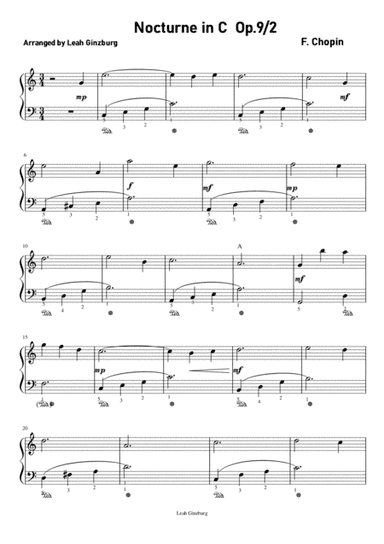 Easy Piano - Level 1 - Digital Download SKU: A0.850086 Composed by Frederic Chopin. Arranged by Leah Ginzburg. Classical,Concert,Romantic Period,Standards,World. Score. 2 pages. Leah Ginzburg #6115415. Published by Leah Ginzburg (A0.850086). Nocturne by F. Chopin, Easy piano, Arranged by Leah Ginzburg, Classical Music, Originally in E-flat Major, arranged in C major. This product was created by a member of ArrangeMe, Hal Leonard’s global self-publishing community of independent composers, arrangers, and songwriters. ArrangeMe allows for the publication of unique arrangements of both popular titles and original compositions from a wide variety of voices and backgrounds. About Digital Downloads Digital Downloads are downloadable sheet music files that can be viewed directly on your computer, tablet or mobile device. Once you download your digital sheet music, you can view and print it at home, school, or anywhere you want to make music, and you don’t have to be connected to the internet. Just purchase, download and play! PLEASE NOTE: Your Digital Download will have a watermark at the bottom of each page that will include your name, purchase date and number of copies purchased. You are only authorized to print the number of copies that you have purchased. You may not digitally distribute or print more copies than purchased for use (i.e., you may not print or digitally distribute individual copies to friends or students).