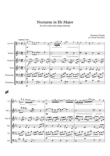 String Ensemble Cello,Double Bass,Viola,Violin - Level 3 - Digital Download SKU: A0.1295172 Composed by Frederic Chopin. Arranged by Claudio Porstmann. 19th Century,Chamber,Classical,Romantic Period. 15 pages. Claudio Porstmann #885492. Published by Claudio Porstmann (A0.1295172). This is a wonderful arrangment for solo violin and string orchestra. An audience favorite, this piece is originally written for solo piano and is very lyrical in nature. This arrangement takes advantage of the expressiveness of ths solo violin and the nuanced accompaniment of the string orchestra to transform the piano lines into a beautiful musical texture that captures the essence of the original but with an increase in spatial volume due to the nature of the string orchestra. This product was created by a member of ArrangeMe, Hal Leonard’s global self-publishing community of independent composers, arrangers, and songwriters. ArrangeMe allows for the publication of unique arrangements of both popular titles and original compositions from a wide variety of voices and backgrounds. About Digital Downloads Digital Downloads are downloadable sheet music files that can be viewed directly on your computer, tablet or mobile device. Once you download your digital sheet music, you can view and print it at home, school, or anywhere you want to make music, and you don’t have to be connected to the internet. Just purchase, download and play! PLEASE NOTE: Your Digital Download will have a watermark at the bottom of each page that will include your name, purchase date and number of copies purchased. You are only authorized to print the number of copies that you have purchased. You may not digitally distribute or print more copies than purchased for use (i.e., you may not print or digitally distribute individual copies to friends or students).