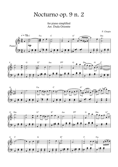 Piano Solo - Level 2 - Digital Download SKU: A0.767022 Composed by Frederic Chopin. Arranged by Duda Oriontte. Classical,Instructional,Romantic Period,Wedding. Score. 2 pages. Duda Oriontte #374648. Published by Duda Oriontte (A0.767022). Nocturno op. 9 no. 2 (piano - SIMPLIFIED - with chords) CHOPIN A great arrangement to use in class You can play with your teacher or you studant (or vice versa) Good study One of most beautiful song ever wrote. This product was created by a member of ArrangeMe, Hal Leonard's global self-publishing community of independent composers, arrangers, and songwriters. ArrangeMe allows for the publication of unique arrangements of popular titles and original compositions from a variety of voices and backgrounds. The length, difficulty, and retail pricing are determined solely by the discretion of the person who arranged or composed it. About Digital Downloads Digital Downloads are downloadable sheet music files that can be viewed directly on your computer, tablet or mobile device. Once you download your digital sheet music, you can view and print it at home, school, or anywhere you want to make music, and you don’t have to be connected to the internet. Just purchase, download and play! PLEASE NOTE: Your Digital Download will have a watermark at the bottom of each page that will include your name, purchase date and number of copies purchased. You are only authorized to print the number of copies that you have purchased. You may not digitally distribute or print more copies than purchased for use (i.e., you may not print or digitally distribute individual copies to friends or students).