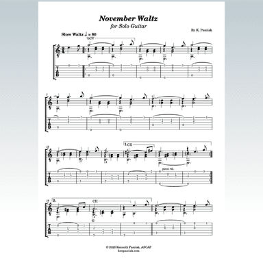 Guitar - Level 2 - Digital Download SKU: A0.1312094 Composed by Kenneth Pasciak. 21st Century,Classical,Romantic Period. Guitar Tab. 7 pages. Kenneth Pasciak #900987. Published by Kenneth Pasciak (A0.1312094). November Waltz by K. Pasciak for solo classical guitar in A minor. Includes 3-page sheet music score with tablature and some fingering suggestions plus individual guitar part without tab. Kenneth Pasciak Music Publishing, ASCAPkenpasciak.comhttps://linktr.ee/kp_sheetmusic/ This product was created by a member of ArrangeMe, Hal Leonard's global self-publishing community of independent composers, arrangers, and songwriters. ArrangeMe allows for the publication of unique arrangements of popular titles and original compositions from a variety of voices and backgrounds. The length, difficulty, and retail pricing are determined solely by the discretion of the person who arranged or composed it. About Digital Downloads Digital Downloads are downloadable sheet music files that can be viewed directly on your computer, tablet or mobile device. Once you download your digital sheet music, you can view and print it at home, school, or anywhere you want to make music, and you don’t have to be connected to the internet. Just purchase, download and play! PLEASE NOTE: Your Digital Download will have a watermark at the bottom of each page that will include your name, purchase date and number of copies purchased. You are only authorized to print the number of copies that you have purchased. You may not digitally distribute or print more copies than purchased for use (i.e., you may not print or digitally distribute individual copies to friends or students).