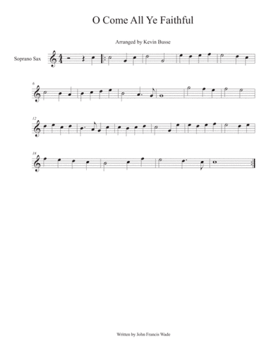 Saxophone Solo,Soprano Saxophone - Level 2 - Digital Download SKU: A0.970401 Composed by Public Domain. Arranged by P.H. Damasceno. Christmas,Sacred,Spiritual. Individual part. 1 pages. P.h. Damasceno #6665237. Published by P.h. Damasceno (A0.970401). Soprano Saxophone Solo. Christmas Music, Children, Adult, Holidays, Sacred, Traditional. For early intermediate musician. By John F. Wade This product was created by a member of ArrangeMe, Hal Leonard’s global self-publishing community of independent composers, arrangers, and songwriters. ArrangeMe allows for the publication of unique arrangements of both popular titles and original compositions from a wide variety of voices and backgrounds. About Digital Downloads Digital Downloads are downloadable sheet music files that can be viewed directly on your computer, tablet or mobile device. Once you download your digital sheet music, you can view and print it at home, school, or anywhere you want to make music, and you don’t have to be connected to the internet. Just purchase, download and play! PLEASE NOTE: Your Digital Download will have a watermark at the bottom of each page that will include your name, purchase date and number of copies purchased. You are only authorized to print the number of copies that you have purchased. You may not digitally distribute or print more copies than purchased for use (i.e., you may not print or digitally distribute individual copies to friends or students).