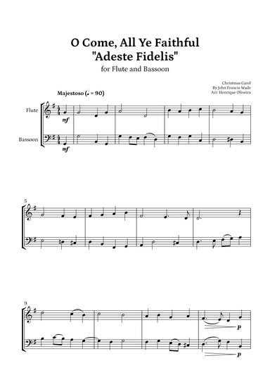 Bassoon,Flute,Instrumental Duet - Level 2 - Digital Download SKU: A0.1312766 Composed by John Francis Wade. Arranged by Henrique Oliveira. Christian,Christmas,Easter,Holiday,Religious. 7 pages. Henrique Oliveira #901609. Published by Henrique Oliveira (A0.1312766). Arrangement of "O Come, All Ye Faithful" for flute and bassoon, perfect to play among your friends, students or family. The PDF file is instantly available with the individual parts and the full score. For more arrangements like this, please make sure to check out my page. This product was created by a member of ArrangeMe, Hal Leonard’s global self-publishing community of independent composers, arrangers, and songwriters. ArrangeMe allows for the publication of unique arrangements of both popular titles and original compositions from a wide variety of voices and backgrounds. About Digital Downloads Digital Downloads are downloadable sheet music files that can be viewed directly on your computer, tablet or mobile device. Once you download your digital sheet music, you can view and print it at home, school, or anywhere you want to make music, and you don’t have to be connected to the internet. Just purchase, download and play! PLEASE NOTE: Your Digital Download will have a watermark at the bottom of each page that will include your name, purchase date and number of copies purchased. You are only authorized to print the number of copies that you have purchased. You may not digitally distribute or print more copies than purchased for use (i.e., you may not print or digitally distribute individual copies to friends or students).
