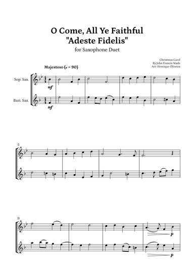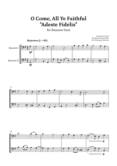 Bassoon,Instrumental Duet - Level 2 - Digital Download SKU: A0.1313070 Composed by John Francis Wade. Arranged by Henrique Oliveira. Christian,Christmas,Easter,Holiday,Religious. 7 pages. Henrique Oliveira #901906. Published by Henrique Oliveira (A0.1313070). Arrangement of "O Come, All Ye Faithful" for bassoon duet, perfect to play among your friends, students or family. The PDF file is instantly available with the individual parts and the full score. For more arrangements like this, please make sure to check out my page. This product was created by a member of ArrangeMe, Hal Leonard’s global self-publishing community of independent composers, arrangers, and songwriters. ArrangeMe allows for the publication of unique arrangements of both popular titles and original compositions from a wide variety of voices and backgrounds. About Digital Downloads Digital Downloads are downloadable sheet music files that can be viewed directly on your computer, tablet or mobile device. Once you download your digital sheet music, you can view and print it at home, school, or anywhere you want to make music, and you don’t have to be connected to the internet. Just purchase, download and play! PLEASE NOTE: Your Digital Download will have a watermark at the bottom of each page that will include your name, purchase date and number of copies purchased. You are only authorized to print the number of copies that you have purchased. You may not digitally distribute or print more copies than purchased for use (i.e., you may not print or digitally distribute individual copies to friends or students).