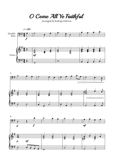 Double Bass,Piano,String Bass - Level 1 - Digital Download SKU: A0.1336169 Composed by Anonymous. Arranged by Rodrigo Faleiros. Children,Christmas,Holiday,Traditional. Score and part. 3 pages. Rodrigo Faleiros #921998. Published by Rodrigo Faleiros (A0.1336169). Celebrate the joy of the season with our heartwarming double bass and piano arrangement of the timeless Christmas carol, "O Come All Ye Faithful." This enchanting rendition is expertly crafted for beginners, making it perfect for students making their way into the magical world of music.Key Features: Beginner-Friendly double bass Part: Dive into the beauty of "O Come All Ye Faithful" with a double bass arrangement designed specifically for those beginning their musical journey. Piano Accompaniment with Chord Symbols: The piano part not only provides a delightful backdrop but also includes chord symbols, offering the opportunity to explore harmonies and play along with ease. Instant Digital Download: Access your double bass and piano sheet music effortlessly with our convenient PDF download. Ideal for holiday performances, family gatherings, or personal enjoyment, this arrangement captures the spirit of Christmas with its accessible double bass melodies and harmonically rich piano accompaniment.And don't forget to check out my other christmas and holiday music arrangements by clicking here! This product was created by a member of ArrangeMe, Hal Leonard’s global self-publishing community of independent composers, arrangers, and songwriters. ArrangeMe allows for the publication of unique arrangements of both popular titles and original compositions from a wide variety of voices and backgrounds. About Digital Downloads Digital Downloads are downloadable sheet music files that can be viewed directly on your computer, tablet or mobile device. Once you download your digital sheet music, you can view and print it at home, school, or anywhere you want to make music, and you don’t have to be connected to the internet. Just purchase, download and play! PLEASE NOTE: Your Digital Download will have a watermark at the bottom of each page that will include your name, purchase date and number of copies purchased. You are only authorized to print the number of copies that you have purchased. You may not digitally distribute or print more copies than purchased for use (i.e., you may not print or digitally distribute individual copies to friends or students).