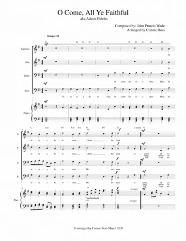 Choral Guitar,Piano,Vocal,Voice - Level 3 - Digital Download SKU: A0.801390 Composed by John Francis Wade. Arranged by Connie Boss. Christmas,Sacred. Score. 3 pages. Connie Boss #5315879. Published by Connie Boss (A0.801390). This starts off building voices and alternating between Latin and English. The rest of the song is in English. It is in SATB and has piano accompaniment. This product was created by a member of ArrangeMe, Hal Leonard’s global self-publishing community of independent composers, arrangers, and songwriters. ArrangeMe allows for the publication of unique arrangements of both popular titles and original compositions from a wide variety of voices and backgrounds. About Digital Downloads Digital Downloads are downloadable sheet music files that can be viewed directly on your computer, tablet or mobile device. Once you download your digital sheet music, you can view and print it at home, school, or anywhere you want to make music, and you don’t have to be connected to the internet. Just purchase, download and play! PLEASE NOTE: Your Digital Download will have a watermark at the bottom of each page that will include your name, purchase date and number of copies purchased. You are only authorized to print the number of copies that you have purchased. You may not digitally distribute or print more copies than purchased for use (i.e., you may not print or digitally distribute individual copies to friends or students).