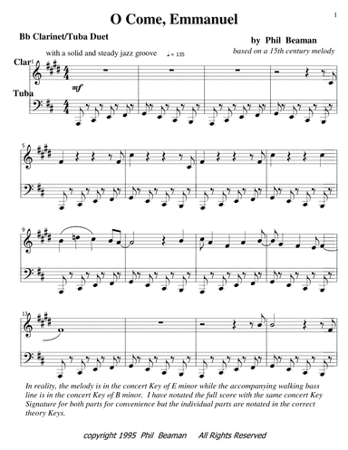 B-Flat Clarinet,Instrumental Duet,Tuba - Level 3 - Digital Download SKU: A0.1349249 Composed by Phil Beaman. Advent,Christmas,Early Music,Jazz,Renaissance. 4 pages. Phil Beaman #933995. Published by Phil Beaman (A0.1349249). This jazz composition is based on the hauntingly beautiful 15th century medieval tune that is commonly used for the Advent carol O Come, O Come, Emmanuel. I have reharmonized it with the accompaniment in a Key Signature a fifth above that of the melody. The accompaniment, part 2, has a broken two chord ostinato throughout written as a walking bass line. I have altered the melody, part 1, and moved much of it to the off beats. As in period early music, I allow occassional dissonances in order to keep the ostinato. This piece makes a wonderfully useful and unique addition to the season's repertoire. (I have also published a version on this site with text so it can be sung by a soloist or unison choir with piano accompaniment.) (Also as a piano solo.)range - part 1 melody - 10th, middle C to E; part 2 walking bass line, octave and a half, bass clef low A below staff to D middle line2 pages score, 1 page @ part, 2:05 minutes. This product was created by a member of ArrangeMe, Hal Leonard’s global self-publishing community of independent composers, arrangers, and songwriters. ArrangeMe allows for the publication of unique arrangements of both popular titles and original compositions from a wide variety of voices and backgrounds. About Digital Downloads Digital Downloads are downloadable sheet music files that can be viewed directly on your computer, tablet or mobile device. Once you download your digital sheet music, you can view and print it at home, school, or anywhere you want to make music, and you don’t have to be connected to the internet. Just purchase, download and play! PLEASE NOTE: Your Digital Download will have a watermark at the bottom of each page that will include your name, purchase date and number of copies purchased. You are only authorized to print the number of copies that you have purchased. You may not digitally distribute or print more copies than purchased for use (i.e., you may not print or digitally distribute individual copies to friends or students).