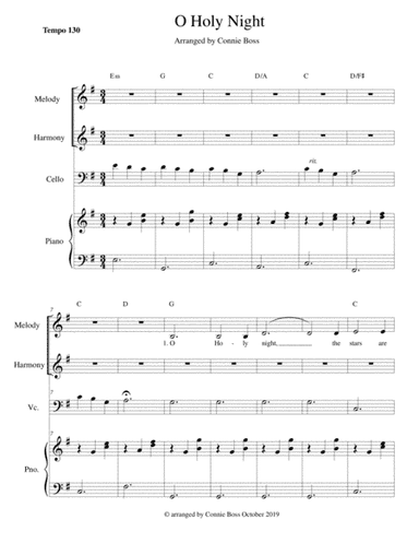Small Ensemble Cello,Guitar,Piano,Voice - Level 2 - Digital Download SKU: A0.801169 Arranged by Connie Boss. Christian,Christmas,Sacred. Score and parts. 13 pages. Connie Boss #4894459. Published by Connie Boss (A0.801169). This arrangement has a very moving cello part and it has a solo in the middle of the piece. I have also added a harmony part that is a little different than the norm and changed the piano accompaniment.also. The piano part is more simple since the other instrument has the moving parts. email [email protected]. This product was created by a member of ArrangeMe, Hal Leonard’s global self-publishing community of independent composers, arrangers, and songwriters. ArrangeMe allows for the publication of unique arrangements of both popular titles and original compositions from a wide variety of voices and backgrounds. About Digital Downloads Digital Downloads are downloadable sheet music files that can be viewed directly on your computer, tablet or mobile device. Once you download your digital sheet music, you can view and print it at home, school, or anywhere you want to make music, and you don’t have to be connected to the internet. Just purchase, download and play! PLEASE NOTE: Your Digital Download will have a watermark at the bottom of each page that will include your name, purchase date and number of copies purchased. You are only authorized to print the number of copies that you have purchased. You may not digitally distribute or print more copies than purchased for use (i.e., you may not print or digitally distribute individual copies to friends or students).