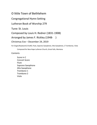 Choral Choir (SA) - Level 2 - Digital Download SKU: A0.729537 Composed by Louis H. Redner. Arranged by James F. Rickley. Christian,Christmas,Sacred. Octavo. 31 pages. WayWordBound #4996273. Published by WayWordBound (A0.729537). Congregational Hymn Setting, Lutheran Book of Worship 279, Christmas Eve – December 24, 2019, For Organ/Keyboard (2 Staff), Flute, Soprano Saxophone, Alto Saxophone, 2 Trombones, Viola. This product was created by a member of ArrangeMe, Hal Leonard’s global self-publishing community of independent composers, arrangers, and songwriters. ArrangeMe allows for the publication of unique arrangements of both popular titles and original compositions from a wide variety of voices and backgrounds. About Digital Downloads Digital Downloads are downloadable sheet music files that can be viewed directly on your computer, tablet or mobile device. Once you download your digital sheet music, you can view and print it at home, school, or anywhere you want to make music, and you don’t have to be connected to the internet. Just purchase, download and play! PLEASE NOTE: Your Digital Download will have a watermark at the bottom of each page that will include your name, purchase date and number of copies purchased. You are only authorized to print the number of copies that you have purchased. You may not digitally distribute or print more copies than purchased for use (i.e., you may not print or digitally distribute individual copies to friends or students).