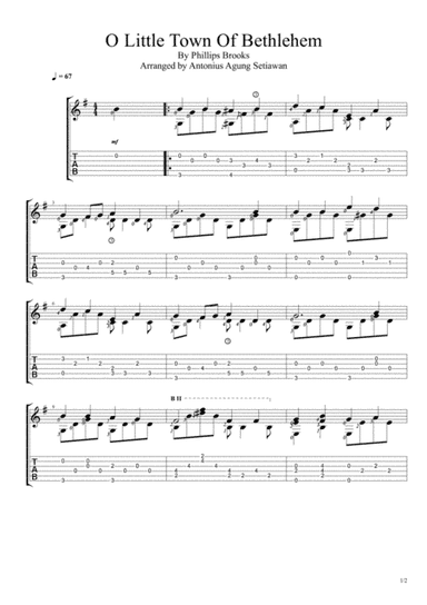 Guitar - Level 3 - Digital Download SKU: A0.949544 Composed by Words: Phillips Brooks/Music: Lewis Redner. Arranged by Chris Richter. Christmas,Praise & Worship,Sacred,Spiritual. Guitar Tab. 1 pages. Chris Richter #6324599. Published by Chris Richter (A0.949544). A solo fingerstyle arrangement of the Christmas carol "O Little Town of Bethlehem" for classical guitar. Words: Phillips Brooks/Music: Lewis Redner. This product was created by a member of ArrangeMe, Hal Leonard's global self-publishing community of independent composers, arrangers, and songwriters. ArrangeMe allows for the publication of unique arrangements of popular titles and original compositions from a variety of voices and backgrounds. The length, difficulty, and retail pricing are determined solely by the discretion of the person who arranged or composed it. About Digital Downloads Digital Downloads are downloadable sheet music files that can be viewed directly on your computer, tablet or mobile device. Once you download your digital sheet music, you can view and print it at home, school, or anywhere you want to make music, and you don’t have to be connected to the internet. Just purchase, download and play! PLEASE NOTE: Your Digital Download will have a watermark at the bottom of each page that will include your name, purchase date and number of copies purchased. You are only authorized to print the number of copies that you have purchased. You may not digitally distribute or print more copies than purchased for use (i.e., you may not print or digitally distribute individual copies to friends or students).
