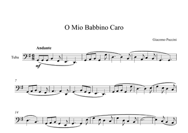 Tuba Solo - Level 1 - Digital Download SKU: A0.1034314 Composed by Giacomo Puccini. Arranged by Digital Book Music. Classical. Individual part. 1 pages. Digital Book Music #639657. Published by Digital Book Music (A0.1034314). O Mio Babbino Caro - Giacomo Puccini (Tuba). This product was created by a member of ArrangeMe, Hal Leonard's global self-publishing community of independent composers, arrangers, and songwriters. ArrangeMe allows for the publication of unique arrangements of popular titles and original compositions from a variety of voices and backgrounds. The length, difficulty, and retail pricing are determined solely by the discretion of the person who arranged or composed it. About Digital Downloads Digital Downloads are downloadable sheet music files that can be viewed directly on your computer, tablet or mobile device. Once you download your digital sheet music, you can view and print it at home, school, or anywhere you want to make music, and you don’t have to be connected to the internet. Just purchase, download and play! PLEASE NOTE: Your Digital Download will have a watermark at the bottom of each page that will include your name, purchase date and number of copies purchased. You are only authorized to print the number of copies that you have purchased. You may not digitally distribute or print more copies than purchased for use (i.e., you may not print or digitally distribute individual copies to friends or students).