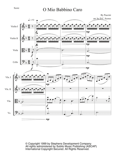 Chamber Orchestra - Level 4 - Digital Download SKU: A0.856307 Composed by Giacomo Puccini. Arranged by Matteo Delfino. Opera,Romantic Period. Score and parts. 7 pages. Matteo Delfino #2021345. Published by Matteo Delfino (A0.856307). O Mio Babbino Caro from Puccini's Gianni Schicchi is a widely popular piece for soprano and orchestra. This arrangement can either be played by 4 solo cellos or many cellos to mimic the effect of the orchestra. Although it is recommended that when played by more than 4 cellos, the first part be played solo to allow more artistic freedom. O Mio Babbino Caro has been arranged in a way that is easily accessible by cellists, in the key of D Major and has been already bowed. This is an advanced-intermediate level piece in which cello 1 is in tenor clef, cello 2 is in both bass and tenor clef, cello 3 and 4 are both completely in bass clef. Visit https://matteodelfino.wordpress.com/category/sheet-music/ for other sheet music titles and recordings! This product was created by a member of ArrangeMe, Hal Leonard's global self-publishing community of independent composers, arrangers, and songwriters. ArrangeMe allows for the publication of unique arrangements of popular titles and original compositions from a variety of voices and backgrounds. The length, difficulty, and retail pricing are determined solely by the discretion of the person who arranged or composed it. About Digital Downloads Digital Downloads are downloadable sheet music files that can be viewed directly on your computer, tablet or mobile device. Once you download your digital sheet music, you can view and print it at home, school, or anywhere you want to make music, and you don’t have to be connected to the internet. Just purchase, download and play! PLEASE NOTE: Your Digital Download will have a watermark at the bottom of each page that will include your name, purchase date and number of copies purchased. You are only authorized to print the number of copies that you have purchased. You may not digitally distribute or print more copies than purchased for use (i.e., you may not print or digitally distribute individual copies to friends or students).