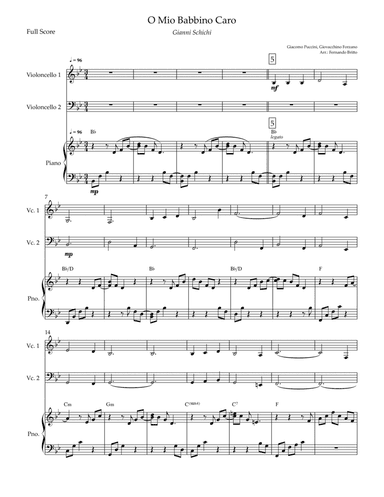 Small Ensemble Cello,Piano - Level 3 - Digital Download SKU: A0.690639 Composed by Giacomo Puccini. Arranged by Fernando Britto. Opera,Wedding. Score and parts. 7 pages. Minhas Partituras #6733765. Published by Minhas Partituras (A0.690639). Arrangement of the song O Mio Babbino Caro (Puccini) for Cello Duo & Piano Accompaniment with Chords. This product was created by a member of ArrangeMe, Hal Leonard’s global self-publishing community of independent composers, arrangers, and songwriters. ArrangeMe allows for the publication of unique arrangements of both popular titles and original compositions from a wide variety of voices and backgrounds. About Digital Downloads Digital Downloads are downloadable sheet music files that can be viewed directly on your computer, tablet or mobile device. Once you download your digital sheet music, you can view and print it at home, school, or anywhere you want to make music, and you don’t have to be connected to the internet. Just purchase, download and play! PLEASE NOTE: Your Digital Download will have a watermark at the bottom of each page that will include your name, purchase date and number of copies purchased. You are only authorized to print the number of copies that you have purchased. You may not digitally distribute or print more copies than purchased for use (i.e., you may not print or digitally distribute individual copies to friends or students).