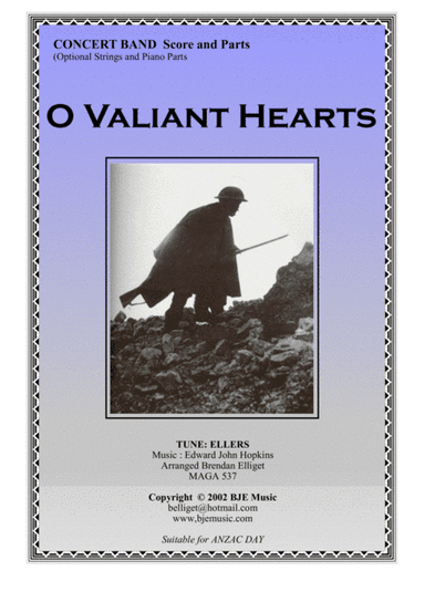 Full Orchestra - Level 2 - Digital Download SKU: A0.750890 Composed by Edward John Hopkins, 1869. Arranged by Brendan Elliget MAGA 537. Christian,Sacred. Score and parts. 41 pages. BJE Music #4366398. Published by BJE Music (A0.750890). "O Valiant Hearts" is a hymn remembering the fallen of the First World War. Words were taken from a poem by Sir John Stanhope Arkwright (1872-1954), published in ’The Supreme Sacrifice, and other Poems in Time of War (1919) The tune used here is "Ellers" (Edward John Hopkins, 1869).Especially appropriate for Anzac Day. This is a fairly straight forward arrangement for concert band with a descant for Trumpet (Clarinet) and/or Flute in the last verse. There are also optional parts for Piano and Strings. Grade = 3  Duration = 1:40 mins. (Two verses only) The MP3 was recorded with NotePerformer 3. This product was created by a member of ArrangeMe, Hal Leonard’s global self-publishing community of independent composers, arrangers, and songwriters. ArrangeMe allows for the publication of unique arrangements of both popular titles and original compositions from a wide variety of voices and backgrounds. About Digital Downloads Digital Downloads are downloadable sheet music files that can be viewed directly on your computer, tablet or mobile device. Once you download your digital sheet music, you can view and print it at home, school, or anywhere you want to make music, and you don’t have to be connected to the internet. Just purchase, download and play! PLEASE NOTE: Your Digital Download will have a watermark at the bottom of each page that will include your name, purchase date and number of copies purchased. You are only authorized to print the number of copies that you have purchased. You may not digitally distribute or print more copies than purchased for use (i.e., you may not print or digitally distribute individual copies to friends or students).