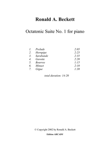 Piano Solo - Level 4 - Digital Download SKU: A0.769546 Composed by Ronald Beckett. 20th Century,Classical,Contest,Festival,Instructional. Score. 19 pages. Ronald Beckett #377182. Published by Ronald Beckett (A0.769546). The Octatonic Suite No. 1 for solo piano was written specifically for the 2002 Arcady CD A Beckett Miscellany. It draws upon the Baroque dance suite structure which by its very design provides contrast from one movement to the next. The stylised dances of this suite follow essentially this anticipated arrangement and its seven pieces are indeed all rooted in F. Of the modes of limited transposition favoured by composers since the early 1900s, the octatonic scale, which alternates whole and half steps, is probably the most useful in that it is able to suggest a full range of harmonic and melodic sonorities. This is a fun and not too difficult suite that pianists enjoy very much. This edition is arranged so as to facilitate page turns. This product was created by a member of ArrangeMe, Hal Leonard’s global self-publishing community of independent composers, arrangers, and songwriters. ArrangeMe allows for the publication of unique arrangements of both popular titles and original compositions from a wide variety of voices and backgrounds. About Digital Downloads Digital Downloads are downloadable sheet music files that can be viewed directly on your computer, tablet or mobile device. Once you download your digital sheet music, you can view and print it at home, school, or anywhere you want to make music, and you don’t have to be connected to the internet. Just purchase, download and play! PLEASE NOTE: Your Digital Download will have a watermark at the bottom of each page that will include your name, purchase date and number of copies purchased. You are only authorized to print the number of copies that you have purchased. You may not digitally distribute or print more copies than purchased for use (i.e., you may not print or digitally distribute individual copies to friends or students).