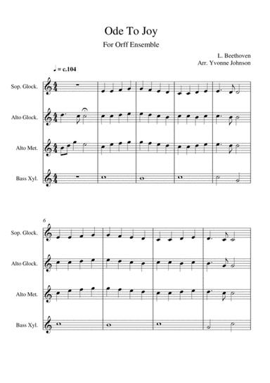Percussion Ensemble - Level 1 - Digital Download SKU: A0.767901 Composed by L. v. Beethoven. Arranged by Yvonne Johnson. Classical,Instructional,Romantic Period,Standards. Score and parts. 8 pages. Yvonne Johnson #2891251. Published by Yvonne Johnson (A0.767901). This lovely melody from Beethoven's 9th symphony has been arranged using simple harmonies and melodic Orff instruments. A fairly easy arrangement, with some broken chord work in the Alto Met part. Marimba could be substituted for the Bass Xyl This product was created by a member of ArrangeMe, Hal Leonard's global self-publishing community of independent composers, arrangers, and songwriters. ArrangeMe allows for the publication of unique arrangements of popular titles and original compositions from a variety of voices and backgrounds. The length, difficulty, and retail pricing are determined solely by the discretion of the person who arranged or composed it. About Digital Downloads Digital Downloads are downloadable sheet music files that can be viewed directly on your computer, tablet or mobile device. Once you download your digital sheet music, you can view and print it at home, school, or anywhere you want to make music, and you don’t have to be connected to the internet. Just purchase, download and play! PLEASE NOTE: Your Digital Download will have a watermark at the bottom of each page that will include your name, purchase date and number of copies purchased. You are only authorized to print the number of copies that you have purchased. You may not digitally distribute or print more copies than purchased for use (i.e., you may not print or digitally distribute individual copies to friends or students).