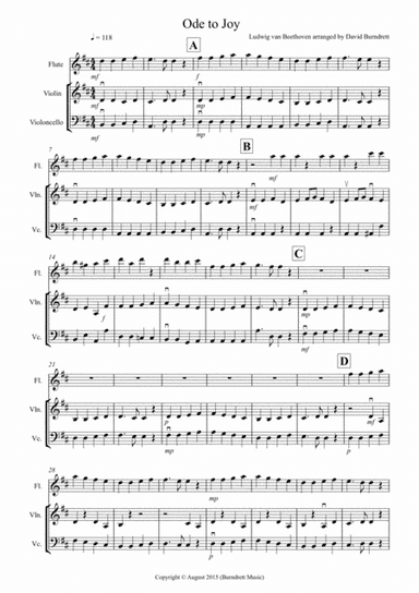 Small Ensemble Cello,Flute,Violin - Level 1 - Digital Download SKU: A0.558595 Composed by Ludwig van Beethoven. Arranged by David Burndrett. Classical. Score and parts. 5 pages. David Burndrett #3907291. Published by David Burndrett (A0.558595). This works well as a concert piece or just for fun.Each part gets the tune.Download includes the score and all of the parts. This product was created by a member of ArrangeMe, Hal Leonard's global self-publishing community of independent composers, arrangers, and songwriters. ArrangeMe allows for the publication of unique arrangements of popular titles and original compositions from a variety of voices and backgrounds. The length, difficulty, and retail pricing are determined solely by the discretion of the person who arranged or composed it. About Digital Downloads Digital Downloads are downloadable sheet music files that can be viewed directly on your computer, tablet or mobile device. Once you download your digital sheet music, you can view and print it at home, school, or anywhere you want to make music, and you don’t have to be connected to the internet. Just purchase, download and play! PLEASE NOTE: Your Digital Download will have a watermark at the bottom of each page that will include your name, purchase date and number of copies purchased. You are only authorized to print the number of copies that you have purchased. You may not digitally distribute or print more copies than purchased for use (i.e., you may not print or digitally distribute individual copies to friends or students).