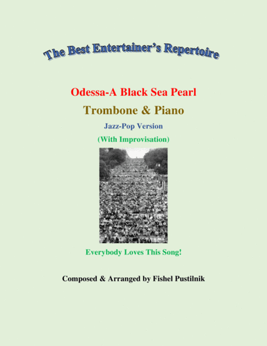 Piano,Trombone - Level 4 - Digital Download SKU: A0.635633 Composed by Fishel Pustilnik. Arranged by Fishel Pustilnik. Film/TV,Jazz,Jewish,Pop. Score and part. 9 pages. F & N Enterprise #5709047. Published by F & N Enterprise (A0.635633). Piano Background Track of famous song "Odessa-A Black Sea Pearl" for Trombone and Piano The video for Violin and Piano: https://youtu.be/slr_kUC8JYU "Plus" Version at SMP: S0.763277  The composition is easy to read, fun to play and sound professional when performed. Arranged by Fishel Pustilnik, very well known as Composer/Publisher. His books "Jazz & Pop Piano Paradise" (Volumes 1-5) have become a commercial success and a hit with music teachers and students in Canada. (Thousands of books already sold in Canada). They are also starting to enter the US, Brazil, Norway, Russia, Holland, Israel, Belgium, Sweden, Finland, Greece, Latvia, and the UK markets. "This is a wonderful new publication. These pieces offer much appeal for the young pianist and excellent choice for a supplementary book for students from Grade 3 to 8." Lore Ruschiensky, Editor, (from the review in "The Canadian Music Teacher") "Yesterday I spent at least two pleasure-filled hours playing through your imaginatively inventive compositions. Congratulations! I trust students will decide to program your well crafted and entertaining works on recitals and examinations." Review from Dr. Jack Behrens, B.Sc. (Julliard), Ph.D. (Harvard), Director of Academic Studies, The Glenn Gould School "I liked this book the best so far. Great work! You have a gift for melody and your arrangements are very playable. Congratulations on the 3rd Volume". Mark Carlstein, Hal Leonard, Keyboard Publications. Additional Information regarding my arrangements at SheetMusicPlus: https://www.facebook.com/arrangementsofsheetmusic/ This product was created by a member of ArrangeMe, Hal Leonard's global self-publishing community of independent composers, arrangers, and songwriters. ArrangeMe allows for the publication of unique arrangements of popular titles and original compositions from a variety of voices and backgrounds. The length, difficulty, and retail pricing are determined solely by the discretion of the person who arranged or composed it. About Digital Downloads Digital Downloads are downloadable sheet music files that can be viewed directly on your computer, tablet or mobile device. Once you download your digital sheet music, you can view and print it at home, school, or anywhere you want to make music, and you don’t have to be connected to the internet. Just purchase, download and play! PLEASE NOTE: Your Digital Download will have a watermark at the bottom of each page that will include your name, purchase date and number of copies purchased. You are only authorized to print the number of copies that you have purchased. You may not digitally distribute or print more copies than purchased for use (i.e., you may not print or digitally distribute individual copies to friends or students).