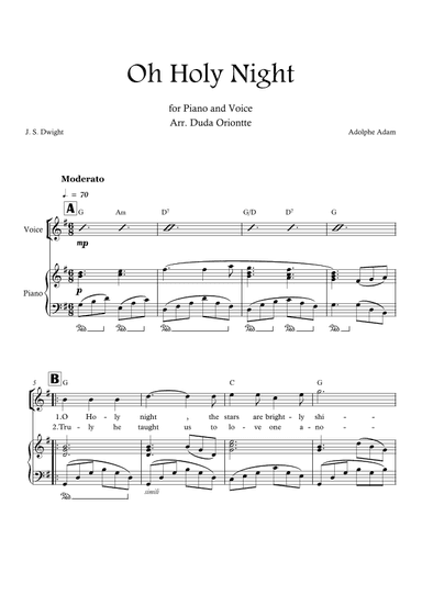 Piano,Vocal,Voice - Level 2 - Digital Download SKU: A0.502816 Composed by Adolphe-Charles Adam. Arranged by Duda Oriontte. Children,Christmas,Holiday,Praise & Worship,Sacred. Score. 5 pages. Duda Oriontte #115179. Published by Duda Oriontte (A0.502816). Oh Holy Night (G major - with chords) Let's celebrate the christmas A great arrangement to use in class Good study Xmas music is always beautiful And i like a lot this piece, i made this arrangement for you to play with your friends. This product was created by a member of ArrangeMe, Hal Leonard's global self-publishing community of independent composers, arrangers, and songwriters. ArrangeMe allows for the publication of unique arrangements of popular titles and original compositions from a variety of voices and backgrounds. The length, difficulty, and retail pricing are determined solely by the discretion of the person who arranged or composed it. About Digital Downloads Digital Downloads are downloadable sheet music files that can be viewed directly on your computer, tablet or mobile device. Once you download your digital sheet music, you can view and print it at home, school, or anywhere you want to make music, and you don’t have to be connected to the internet. Just purchase, download and play! PLEASE NOTE: Your Digital Download will have a watermark at the bottom of each page that will include your name, purchase date and number of copies purchased. You are only authorized to print the number of copies that you have purchased. You may not digitally distribute or print more copies than purchased for use (i.e., you may not print or digitally distribute individual copies to friends or students).