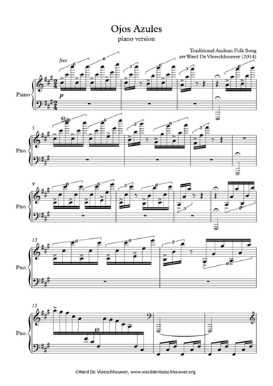 Piano Solo - Digital Download SKU: A0.925362 Composed by Ward De Vleeschhouwer. Contemporary. Score. 8 pages. Ward De Vleeschhouwer #6232177. Published by Ward De Vleeschhouwer (A0.925362). Ojos Azules is a traditional huayno song of the Andean Altiplano region.This an arrangement for piano solo.Stream/download on all digital platforms (Spotify, iTunes, Apple Music, Deezer,.....)https://ditto.fm/ojos-azules This product was created by a member of ArrangeMe, Hal Leonard’s global self-publishing community of independent composers, arrangers, and songwriters. ArrangeMe allows for the publication of unique arrangements of both popular titles and original compositions from a wide variety of voices and backgrounds. About Digital Downloads Digital Downloads are downloadable sheet music files that can be viewed directly on your computer, tablet or mobile device. Once you download your digital sheet music, you can view and print it at home, school, or anywhere you want to make music, and you don’t have to be connected to the internet. Just purchase, download and play! PLEASE NOTE: Your Digital Download will have a watermark at the bottom of each page that will include your name, purchase date and number of copies purchased. You are only authorized to print the number of copies that you have purchased. You may not digitally distribute or print more copies than purchased for use (i.e., you may not print or digitally distribute individual copies to friends or students).