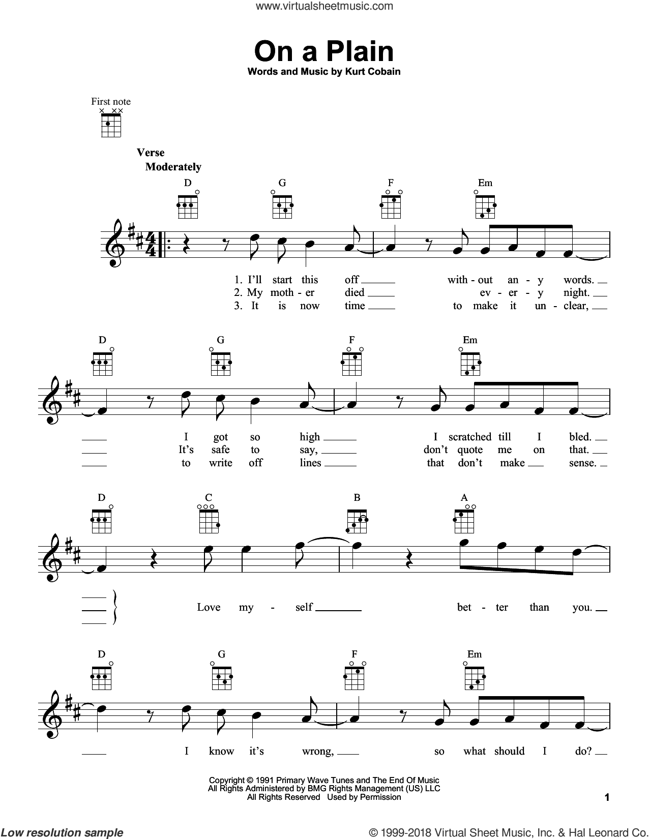 Digital sheet music for ukulele, melody, chords, and lyrics.Publisher: Hal LeonardContributors to this music title:Kurt Cobain (writer)This item includes: PDF (digital sheet music to download and print), Interactive Sheet Music (for online playback, transposition and printing). You can transpose this music in any key.Instrumentation:ukuleleSkill Level:intermediateGenre:alternative, pop, rockPages:3
