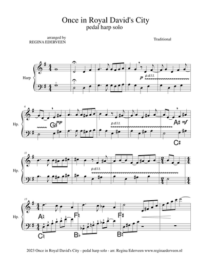 Pedal Harp - Level 4 - Digital Download SKU: A0.1264629 By Regina Ederveen. By Regina Ederveen. Arranged by Regina Ederveen. Christian,Christmas,Classical,Hanukkah,Religious. Score. 4 pages. R. Ederveen #857458. Published by R. Ederveen (A0.1264629). Once in Royal David's City - pedal harp solo traditional, arranged for pedal harp by harpist Regina Ederveen www.reginaederveen.nl This product was created by a member of ArrangeMe, Hal Leonard’s global self-publishing community of independent composers, arrangers, and songwriters. ArrangeMe allows for the publication of unique arrangements of both popular titles and original compositions from a wide variety of voices and backgrounds. About Digital Downloads Digital Downloads are downloadable sheet music files that can be viewed directly on your computer, tablet or mobile device. Once you download your digital sheet music, you can view and print it at home, school, or anywhere you want to make music, and you don’t have to be connected to the internet. Just purchase, download and play! PLEASE NOTE: Your Digital Download will have a watermark at the bottom of each page that will include your name, purchase date and number of copies purchased. You are only authorized to print the number of copies that you have purchased. You may not digitally distribute or print more copies than purchased for use (i.e., you may not print or digitally distribute individual copies to friends or students).