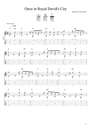 Guitar - Level 2 - Digital Download SKU: A0.808727 By Alex Bett. By Cecil Frances Alexander. Arranged by Alex Bett. Christmas,Praise & Worship,Sacred. Guitar Tab. 1 pages. Alexander Bett #6118795. Published by Alexander Bett (A0.808727). Solo fingerstyle guitar arrangement of Once in Royals David's City This product was created by a member of ArrangeMe, Hal Leonard’s global self-publishing community of independent composers, arrangers, and songwriters. ArrangeMe allows for the publication of unique arrangements of both popular titles and original compositions from a wide variety of voices and backgrounds. About Digital Downloads Digital Downloads are downloadable sheet music files that can be viewed directly on your computer, tablet or mobile device. Once you download your digital sheet music, you can view and print it at home, school, or anywhere you want to make music, and you don’t have to be connected to the internet. Just purchase, download and play! PLEASE NOTE: Your Digital Download will have a watermark at the bottom of each page that will include your name, purchase date and number of copies purchased. You are only authorized to print the number of copies that you have purchased. You may not digitally distribute or print more copies than purchased for use (i.e., you may not print or digitally distribute individual copies to friends or students).