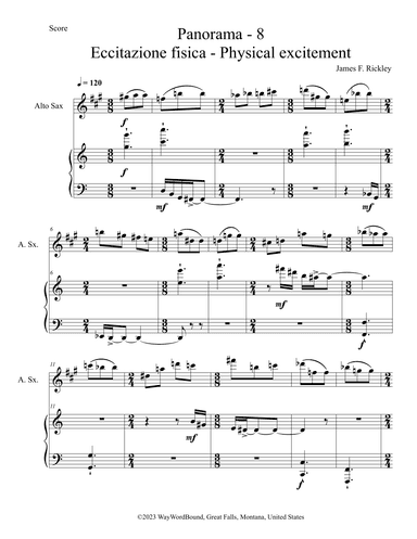 Alto Saxophone,Piano - Level 5 - Digital Download SKU: A0.1318392 Composed by James F. Rickley. 21st Century,Classical,Contemporary. Score and part. 5 pages. WayWordBound #907053. Published by WayWordBound (A0.1318392). Panorama 8 Eccitazione fisica - Physical Excitement for Alto Saxophone and Keyboard, James F. Rickley, Composer. This product was created by a member of ArrangeMe, Hal Leonard’s global self-publishing community of independent composers, arrangers, and songwriters. ArrangeMe allows for the publication of unique arrangements of both popular titles and original compositions from a wide variety of voices and backgrounds. About Digital Downloads Digital Downloads are downloadable sheet music files that can be viewed directly on your computer, tablet or mobile device. Once you download your digital sheet music, you can view and print it at home, school, or anywhere you want to make music, and you don’t have to be connected to the internet. Just purchase, download and play! PLEASE NOTE: Your Digital Download will have a watermark at the bottom of each page that will include your name, purchase date and number of copies purchased. You are only authorized to print the number of copies that you have purchased. You may not digitally distribute or print more copies than purchased for use (i.e., you may not print or digitally distribute individual copies to friends or students).