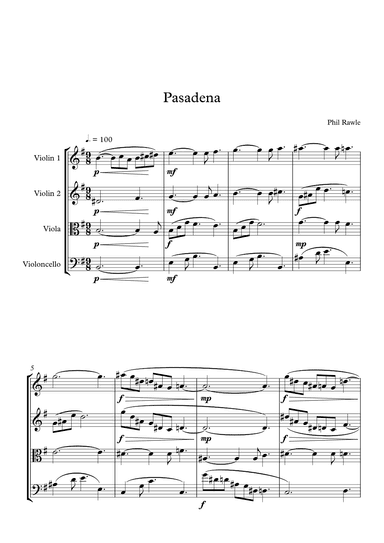 String Quartet Cello,String Quartet,Viola,Violin - Level 3 - Digital Download SKU: A0.1270249 Composed by Phil Rawle. Chamber,Classical,Contemporary. 15 pages. Phillip Rawle #862684. Published by Phillip Rawle (A0.1270249). A modern and sophisticated piece reflecting life in a vibrant city. Brass quartet - Violin 1, Violin 2, Viola, 'Cello. Lively but not too difficult. This product was created by a member of ArrangeMe, Hal Leonard's global self-publishing community of independent composers, arrangers, and songwriters. ArrangeMe allows for the publication of unique arrangements of popular titles and original compositions from a variety of voices and backgrounds. The length, difficulty, and retail pricing are determined solely by the discretion of the person who arranged or composed it. About Digital Downloads Digital Downloads are downloadable sheet music files that can be viewed directly on your computer, tablet or mobile device. Once you download your digital sheet music, you can view and print it at home, school, or anywhere you want to make music, and you don’t have to be connected to the internet. Just purchase, download and play! PLEASE NOTE: Your Digital Download will have a watermark at the bottom of each page that will include your name, purchase date and number of copies purchased. You are only authorized to print the number of copies that you have purchased. You may not digitally distribute or print more copies than purchased for use (i.e., you may not print or digitally distribute individual copies to friends or students).