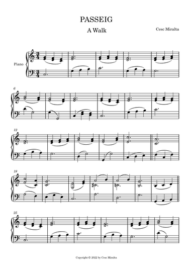 Piano Solo - Level 2 - Digital Download SKU: A0.1146156 By Cesc Miralta. By Cesc Miralta. Arranged by Cesc Miralta. Classical. Score. 2 pages. Cesc Miralta #746400. Published by Cesc Miralta (A0.1146156). This product was created by a member of ArrangeMe, Hal Leonard’s global self-publishing community of independent composers, arrangers, and songwriters. ArrangeMe allows for the publication of unique arrangements of both popular titles and original compositions from a wide variety of voices and backgrounds. About Digital Downloads Digital Downloads are downloadable sheet music files that can be viewed directly on your computer, tablet or mobile device. Once you download your digital sheet music, you can view and print it at home, school, or anywhere you want to make music, and you don’t have to be connected to the internet. Just purchase, download and play! PLEASE NOTE: Your Digital Download will have a watermark at the bottom of each page that will include your name, purchase date and number of copies purchased. You are only authorized to print the number of copies that you have purchased. You may not digitally distribute or print more copies than purchased for use (i.e., you may not print or digitally distribute individual copies to friends or students).