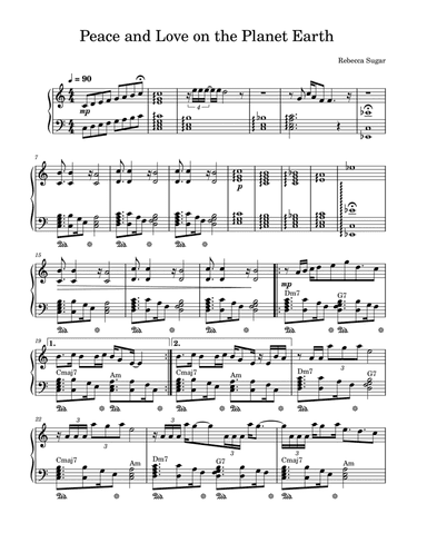 Piano Solo - Level 3 - Digital Download SKU: A0.1014733 By Steven Universe. By Aivi Tran, Jeffrey Chaplin Liu, Rebecca Rea Sugar, and Steven Velema. Arranged by Kingviper. Contemporary. Score. 3 pages. Kingviper #6868455. Published by Kingviper (A0.1014733). Steven teaches Peridot about music. This product was created by a member of ArrangeMe, Hal Leonard's global self-publishing community of independent composers, arrangers, and songwriters. ArrangeMe allows for the publication of unique arrangements of popular titles and original compositions from a variety of voices and backgrounds. The length, difficulty, and retail pricing are determined solely by the discretion of the person who arranged or composed it. About Digital Downloads Digital Downloads are downloadable sheet music files that can be viewed directly on your computer, tablet or mobile device. Once you download your digital sheet music, you can view and print it at home, school, or anywhere you want to make music, and you don’t have to be connected to the internet. Just purchase, download and play! PLEASE NOTE: Your Digital Download will have a watermark at the bottom of each page that will include your name, purchase date and number of copies purchased. You are only authorized to print the number of copies that you have purchased. You may not digitally distribute or print more copies than purchased for use (i.e., you may not print or digitally distribute individual copies to friends or students).