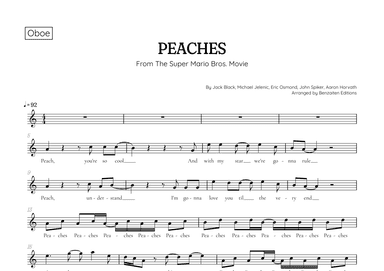 Flute,Piano - Level 2 - Digital Download SKU: A0.1219318 By Jack Black. By Aaron Horvath, Eric Osmond, Jack Black, John Spiker, and Michael Jelenic. Arranged by Márcio Silva. Children,Film/TV,Pop,Rock,Video Game. Score and part. 7 pages. Márcio Silva #815714. Published by Márcio Silva (A0.1219318). Peaches" is a song by Jack Black that was released on April 7, 2023.The song was written for The Super Mario Bros. Movie where Black's character, Bowser, performs the song on a piano to secretly confess his love for Princess Peach. Arrangement for Flute and Piano in the Key of Eb Major or Relative Minor.With chords.Easy Piano to accompany the Flute. This product was created by a member of ArrangeMe, Hal Leonard’s global self-publishing community of independent composers, arrangers, and songwriters. ArrangeMe allows for the publication of unique arrangements of both popular titles and original compositions from a wide variety of voices and backgrounds. About Digital Downloads Digital Downloads are downloadable sheet music files that can be viewed directly on your computer, tablet or mobile device. Once you download your digital sheet music, you can view and print it at home, school, or anywhere you want to make music, and you don’t have to be connected to the internet. Just purchase, download and play! PLEASE NOTE: Your Digital Download will have a watermark at the bottom of each page that will include your name, purchase date and number of copies purchased. You are only authorized to print the number of copies that you have purchased. You may not digitally distribute or print more copies than purchased for use (i.e., you may not print or digitally distribute individual copies to friends or students).