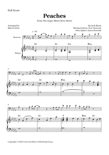 Cello,Piano - Level 2 - Digital Download SKU: A0.1219427 By Jack Black. By Aaron Horvath, Eric Osmond, Jack Black, John Spiker, and Michael Jelenic. Arranged by Márcio Silva. Children,Film/TV,Pop,Rock,Video Game. Score and part. 7 pages. Márcio Silva #815825. Published by Márcio Silva (A0.1219427). Peaches" is a song by Jack Black that was released on April 7, 2023.The song was written for The Super Mario Bros. Movie where Black's character, Bowser, performs the song on a piano to secretly confess his love for Princess Peach. Arrangement for Violoncello and Piano in the Key of F Major or Relative Minor.With chords.Easy Piano to accompany the Violoncello. This product was created by a member of ArrangeMe, Hal Leonard’s global self-publishing community of independent composers, arrangers, and songwriters. ArrangeMe allows for the publication of unique arrangements of both popular titles and original compositions from a wide variety of voices and backgrounds. About Digital Downloads Digital Downloads are downloadable sheet music files that can be viewed directly on your computer, tablet or mobile device. Once you download your digital sheet music, you can view and print it at home, school, or anywhere you want to make music, and you don’t have to be connected to the internet. Just purchase, download and play! PLEASE NOTE: Your Digital Download will have a watermark at the bottom of each page that will include your name, purchase date and number of copies purchased. You are only authorized to print the number of copies that you have purchased. You may not digitally distribute or print more copies than purchased for use (i.e., you may not print or digitally distribute individual copies to friends or students).