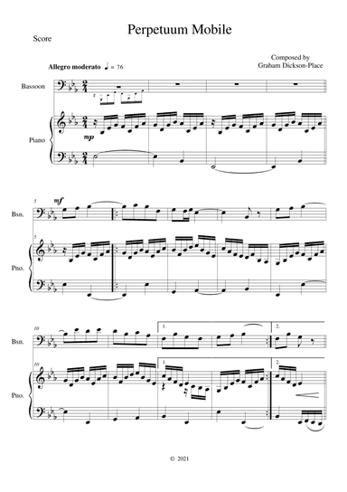 Bassoon,Piano - Level 3 - Digital Download SKU: A0.986204 Composed by Graham Dickson-Place. 20th Century,Concert,Holiday,Standards,Wedding. Score and part. 6 pages. Gramonimusica 2021 #6422969. Published by Gramonimusica 2021 (A0.986204). This is a delightful duet for Bassoon and Piano. Standard - Intermediate. Duration - 2' 18". It would make an ideal part of a concert or recital. This product was created by a member of ArrangeMe, Hal Leonard’s global self-publishing community of independent composers, arrangers, and songwriters. ArrangeMe allows for the publication of unique arrangements of both popular titles and original compositions from a wide variety of voices and backgrounds. About Digital Downloads Digital Downloads are downloadable sheet music files that can be viewed directly on your computer, tablet or mobile device. Once you download your digital sheet music, you can view and print it at home, school, or anywhere you want to make music, and you don’t have to be connected to the internet. Just purchase, download and play! PLEASE NOTE: Your Digital Download will have a watermark at the bottom of each page that will include your name, purchase date and number of copies purchased. You are only authorized to print the number of copies that you have purchased. You may not digitally distribute or print more copies than purchased for use (i.e., you may not print or digitally distribute individual copies to friends or students).