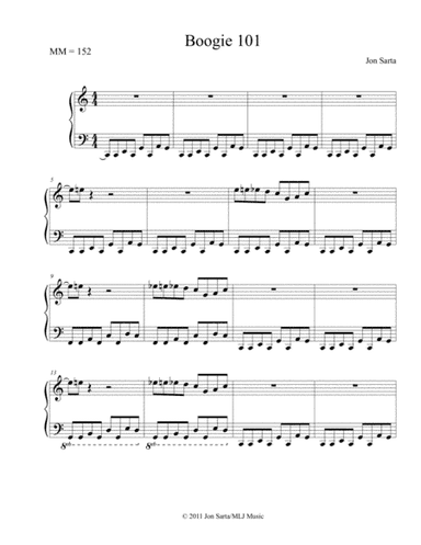 Piano Solo - Level 4 - Digital Download SKU: A0.511383 Composed by Jon Sarta. Blues,Jazz. Score. 8 pages. Jon Sarta / MLJ Music #2849579. Published by Jon Sarta / MLJ Music (A0.511383). Upper intermediate piano Boogie Woogie. Simple groove requires a steady left hand. Perfect for a recital This product was created by a member of ArrangeMe, Hal Leonard's global self-publishing community of independent composers, arrangers, and songwriters. ArrangeMe allows for the publication of unique arrangements of popular titles and original compositions from a variety of voices and backgrounds. The length, difficulty, and retail pricing are determined solely by the discretion of the person who arranged or composed it. About Digital Downloads Digital Downloads are downloadable sheet music files that can be viewed directly on your computer, tablet or mobile device. Once you download your digital sheet music, you can view and print it at home, school, or anywhere you want to make music, and you don’t have to be connected to the internet. Just purchase, download and play! PLEASE NOTE: Your Digital Download will have a watermark at the bottom of each page that will include your name, purchase date and number of copies purchased. You are only authorized to print the number of copies that you have purchased. You may not digitally distribute or print more copies than purchased for use (i.e., you may not print or digitally distribute individual copies to friends or students).