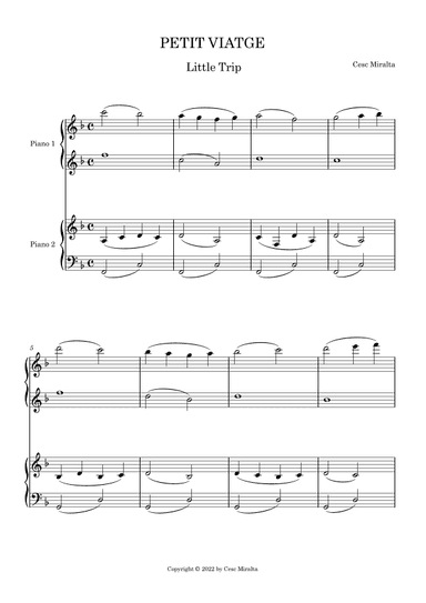 2 Pianos,4 Hands,Piano Duet - Level 2 - Digital Download SKU: A0.1136130 By Cesc Miralta. By Cesc Miralta. Arranged by Cesc Miralta. Children,Classical. Score. 4 pages. Cesc Miralta #736159. Published by Cesc Miralta (A0.1136130). Composition for beginner children. For 2 PIANOS (4 hands). This product was created by a member of ArrangeMe, Hal Leonard's global self-publishing community of independent composers, arrangers, and songwriters. ArrangeMe allows for the publication of unique arrangements of popular titles and original compositions from a variety of voices and backgrounds. The length, difficulty, and retail pricing are determined solely by the discretion of the person who arranged or composed it. About Digital Downloads Digital Downloads are downloadable sheet music files that can be viewed directly on your computer, tablet or mobile device. Once you download your digital sheet music, you can view and print it at home, school, or anywhere you want to make music, and you don’t have to be connected to the internet. Just purchase, download and play! PLEASE NOTE: Your Digital Download will have a watermark at the bottom of each page that will include your name, purchase date and number of copies purchased. You are only authorized to print the number of copies that you have purchased. You may not digitally distribute or print more copies than purchased for use (i.e., you may not print or digitally distribute individual copies to friends or students).