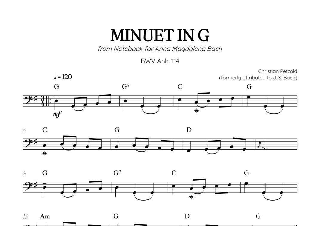 Petzold (Bach) Minuet in G BWV Anh 114 | bassoon solo (with chords) (arr. Benzaiten Editions)
