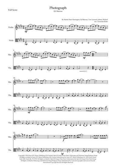 Instrumental Duet Instrumental Duet,Viola,Violin - Level 2 - Digital Download SKU: A0.1080793 By Ed Sheeran. By Ed Sheeran, Johnny McDaid, Martin Peter Harrington, and Tom Leonard. Arranged by Marina Molaro. 20th Century. Score and parts. 4 pages. Molaro Marina #685035. Published by Molaro Marina (A0.1080793). Appropriate for Schools, Students and Amateurs. This product was created by a member of ArrangeMe, Hal Leonard's global self-publishing community of independent composers, arrangers, and songwriters. ArrangeMe allows for the publication of unique arrangements of popular titles and original compositions from a variety of voices and backgrounds. The length, difficulty, and retail pricing are determined solely by the discretion of the person who arranged or composed it. About Digital Downloads Digital Downloads are downloadable sheet music files that can be viewed directly on your computer, tablet or mobile device. Once you download your digital sheet music, you can view and print it at home, school, or anywhere you want to make music, and you don’t have to be connected to the internet. Just purchase, download and play! PLEASE NOTE: Your Digital Download will have a watermark at the bottom of each page that will include your name, purchase date and number of copies purchased. You are only authorized to print the number of copies that you have purchased. You may not digitally distribute or print more copies than purchased for use (i.e., you may not print or digitally distribute individual copies to friends or students).