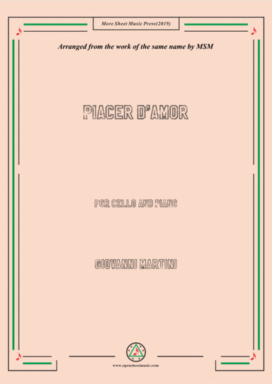 Piano Solo - Level 2 - Digital Download SKU: A0.1181149 By G.Martini. By G.Martini. Arranged by pfkaori. Classical. Score. 2 pages. Pfkaorimusic #780984. Published by pfkaorimusic (A0.1181149). Composer: Martini song; PiacerD'amor Arrangement: piano solo Level: Intermediate Tone: GdurPlease try it ♪. This product was created by a member of ArrangeMe, Hal Leonard’s global self-publishing community of independent composers, arrangers, and songwriters. ArrangeMe allows for the publication of unique arrangements of both popular titles and original compositions from a wide variety of voices and backgrounds. About Digital Downloads Digital Downloads are downloadable sheet music files that can be viewed directly on your computer, tablet or mobile device. Once you download your digital sheet music, you can view and print it at home, school, or anywhere you want to make music, and you don’t have to be connected to the internet. Just purchase, download and play! PLEASE NOTE: Your Digital Download will have a watermark at the bottom of each page that will include your name, purchase date and number of copies purchased. You are only authorized to print the number of copies that you have purchased. You may not digitally distribute or print more copies than purchased for use (i.e., you may not print or digitally distribute individual copies to friends or students).