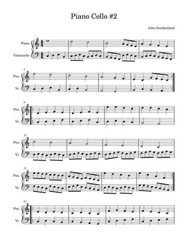Cello,Piano - Level 2 - Digital Download SKU: A0.1314057 By Strange John. By John Southerland. 21st Century,Classical,Contemporary. Score and part. 2 pages. Strange John #902789. Published by Strange John (A0.1314057). This product was created by a member of ArrangeMe, Hal Leonard's global self-publishing community of independent composers, arrangers, and songwriters. ArrangeMe allows for the publication of unique arrangements of popular titles and original compositions from a variety of voices and backgrounds. The length, difficulty, and retail pricing are determined solely by the discretion of the person who arranged or composed it. About Digital Downloads Digital Downloads are downloadable sheet music files that can be viewed directly on your computer, tablet or mobile device. Once you download your digital sheet music, you can view and print it at home, school, or anywhere you want to make music, and you don’t have to be connected to the internet. Just purchase, download and play! PLEASE NOTE: Your Digital Download will have a watermark at the bottom of each page that will include your name, purchase date and number of copies purchased. You are only authorized to print the number of copies that you have purchased. You may not digitally distribute or print more copies than purchased for use (i.e., you may not print or digitally distribute individual copies to friends or students).