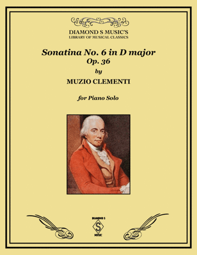 Piano Solo - Digital Download SKU: A0.790170 Composed by Muzio Clementi. Arranged by Muzio Clementi. Children,Classical,Concert,Romantic Period. Score. 11 pages. Diamond S Music #5751623. Published by Diamond S Music (A0.790170). Piano Sonatina No.6 in D major, Op. 36 - Clementi - Piano Solo.  The six Progressive Pianoforte Sonatinas were written in 1797 and revised in 1820. His interest in teaching is also shown by the "Six progressive Sonatinas" op. 36 – six sonatinas in ascending order of difficulty, which are still extremely popular with today's piano teachers. Our edition follows the long established practice of using the musical text of the first edition from 1797. Clementi’s original fingering, which is surprisingly modern, has been included throughout the work. Also contain a brief biography of composer, Clementi and a Thematic Index of All 6 Sonatinas. (For a much reduced price All Six Sonatinas (46 pages in total) can be purchased together in this set: S0.791523)Other similar arrangements and selections from DIAMOND S MUSIC available at: https://www.sheetmusicplus.com/publishers/diamond-s-music/6940 This product was created by a member of ArrangeMe, Hal Leonard's global self-publishing community of independent composers, arrangers, and songwriters. ArrangeMe allows for the publication of unique arrangements of popular titles and original compositions from a variety of voices and backgrounds. The length, difficulty, and retail pricing are determined solely by the discretion of the person who arranged or composed it. About Digital Downloads Digital Downloads are downloadable sheet music files that can be viewed directly on your computer, tablet or mobile device. Once you download your digital sheet music, you can view and print it at home, school, or anywhere you want to make music, and you don’t have to be connected to the internet. Just purchase, download and play! PLEASE NOTE: Your Digital Download will have a watermark at the bottom of each page that will include your name, purchase date and number of copies purchased. You are only authorized to print the number of copies that you have purchased. You may not digitally distribute or print more copies than purchased for use (i.e., you may not print or digitally distribute individual copies to friends or students).