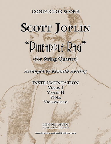 String Quartet String Quartet,Violin - Level 4 - Digital Download SKU: A0.524849 Composed by Scott Joplin. Arranged by John A. Dempsey. Film/TV,Holiday,Patriotic,Ragtime,Standards. Score and parts. 22 pages. John A. Dempsey #6412751. Published by John A. Dempsey (A0.524849). Scott Joplin's effervescent, rollicking "Pineapple Rag" is arranged here as a violin quartet. Recommended for concerts, recitals and other multiple venues; especially popular as an encore! Featured in the movie THE STING and the TV series WESTWORLD. 18 pages of music (that includes the score and separate two-page parts for violin 1, violin 2, violin 3 and violin 4). Key: C major / modulates to G major. This product was created by a member of ArrangeMe, Hal Leonard’s global self-publishing community of independent composers, arrangers, and songwriters. ArrangeMe allows for the publication of unique arrangements of both popular titles and original compositions from a wide variety of voices and backgrounds. About Digital Downloads Digital Downloads are downloadable sheet music files that can be viewed directly on your computer, tablet or mobile device. Once you download your digital sheet music, you can view and print it at home, school, or anywhere you want to make music, and you don’t have to be connected to the internet. Just purchase, download and play! PLEASE NOTE: Your Digital Download will have a watermark at the bottom of each page that will include your name, purchase date and number of copies purchased. You are only authorized to print the number of copies that you have purchased. You may not digitally distribute or print more copies than purchased for use (i.e., you may not print or digitally distribute individual copies to friends or students).