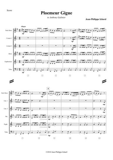 Brass Ensemble - Level 4 - Digital Download SKU: A0.905027 Composed by Jean-Philippe Ichard. Contemporary. Score and parts. 27 pages. Jean-Philippe Ichard #3879771. Published by Jean-Philippe Ichard (A0.905027). "Ploemeur Gigue" for Brass Band Quintet and Solo Tenor Horn. (Included Tuba, Eb Bass and Bb Bass parts)Duration 2:46 minThe piece is a tribute to Brittany, the region in France where Anthony Galinier is particulary dear to his heart. "Ploemeur Gigue" is a merry piece adopting the rhythm of a quick traditionnal dance : the jig. Composed for solo tenor horn and a brass quintet, this piece is permeated with allusions to traditional Breton music with harmonic colours combining ancient and modern rhythms. with allusions to traditionnal Breton music with harmonic colours combining ancient and modern rhythms.Official website - https://www.jeanphilippeichard.com@SACEM This product was created by a member of ArrangeMe, Hal Leonard’s global self-publishing community of independent composers, arrangers, and songwriters. ArrangeMe allows for the publication of unique arrangements of both popular titles and original compositions from a wide variety of voices and backgrounds. About Digital Downloads Digital Downloads are downloadable sheet music files that can be viewed directly on your computer, tablet or mobile device. Once you download your digital sheet music, you can view and print it at home, school, or anywhere you want to make music, and you don’t have to be connected to the internet. Just purchase, download and play! PLEASE NOTE: Your Digital Download will have a watermark at the bottom of each page that will include your name, purchase date and number of copies purchased. You are only authorized to print the number of copies that you have purchased. You may not digitally distribute or print more copies than purchased for use (i.e., you may not print or digitally distribute individual copies to friends or students).