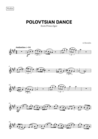 Violin Solo - Level 3 - Digital Download SKU: A0.763396 Composed by Alexander Borodin. Arranged by Nigel Williams. Instructional,Standards,World. 1 pages. Nigel Williams #5337287. Published by Nigel Williams (A0.763396). The popular and well known tune by Alexander Borodin makes for a splendid solo piece for violin. This arrangement is ideal for teachers and High School students working from home and looking for new and innovative repertoire. The performance duration is well over two minutes and the score has phrasing suggested. Enjoy browsing my many string ensemble arrangements on SMP. This product was created by a member of ArrangeMe, Hal Leonard's global self-publishing community of independent composers, arrangers, and songwriters. ArrangeMe allows for the publication of unique arrangements of popular titles and original compositions from a variety of voices and backgrounds. The length, difficulty, and retail pricing are determined solely by the discretion of the person who arranged or composed it. About Digital Downloads Digital Downloads are downloadable sheet music files that can be viewed directly on your computer, tablet or mobile device. Once you download your digital sheet music, you can view and print it at home, school, or anywhere you want to make music, and you don’t have to be connected to the internet. Just purchase, download and play! PLEASE NOTE: Your Digital Download will have a watermark at the bottom of each page that will include your name, purchase date and number of copies purchased. You are only authorized to print the number of copies that you have purchased. You may not digitally distribute or print more copies than purchased for use (i.e., you may not print or digitally distribute individual copies to friends or students).