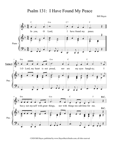 Piano,Vocal,Voice - Level 3 - Digital Download SKU: A0.832624 Composed by Bill Hayes. Christian,Praise & Worship,Sacred,Spiritual. Score. 2 pages. Www.HayesMusicPublishing.com #6456153. Published by www.HayesMusicPublishing.com (A0.832624). Psalm 131:  In You, O Lord, I Have Found My Peace is written in a piano/vocal format with ICEL lyrics and chord symbols; Appropriate for the 31st Sunday in Ordinary Time, Year A, as well as personal reflection. This product was created by a member of ArrangeMe, Hal Leonard’s global self-publishing community of independent composers, arrangers, and songwriters. ArrangeMe allows for the publication of unique arrangements of both popular titles and original compositions from a wide variety of voices and backgrounds. About Digital Downloads Digital Downloads are downloadable sheet music files that can be viewed directly on your computer, tablet or mobile device. Once you download your digital sheet music, you can view and print it at home, school, or anywhere you want to make music, and you don’t have to be connected to the internet. Just purchase, download and play! PLEASE NOTE: Your Digital Download will have a watermark at the bottom of each page that will include your name, purchase date and number of copies purchased. You are only authorized to print the number of copies that you have purchased. You may not digitally distribute or print more copies than purchased for use (i.e., you may not print or digitally distribute individual copies to friends or students).
