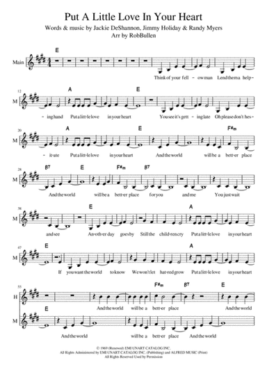 Guitar - Digital Download SKU: AX.00-PC-0001293_G Guitar. Composed by Jackie De Shannon, Jimmy Holiday, and Randy Myers. Arranged by Jay Althouse. Instructional. Part. 2 pages. Alfred Music - Digital Sheet Music #00-PC-0001293_G. Published by Alfred Music - Digital Sheet Music (AX.00-PC-0001293_G). UPC: 038081294247.The tempo indication says "with a groove," and we couldn't think of better words to describe it. This arrangement cooks! It's funky, with a twist of soul. And the lyrics are upbeat and positive: "Think of your fellow man, give him a helping hand. Put a little love in your heart.". About Digital Downloads Digital Downloads are downloadable sheet music files that can be viewed directly on your computer, tablet or mobile device. Once you download your digital sheet music, you can view and print it at home, school, or anywhere you want to make music, and you don’t have to be connected to the internet. Just purchase, download and play! PLEASE NOTE: Your Digital Download will have a watermark at the bottom of each page that will include your name, purchase date and number of copies purchased. You are only authorized to print the number of copies that you have purchased. You may not digitally distribute or print more copies than purchased for use (i.e., you may not print or digitally distribute individual copies to friends or students).